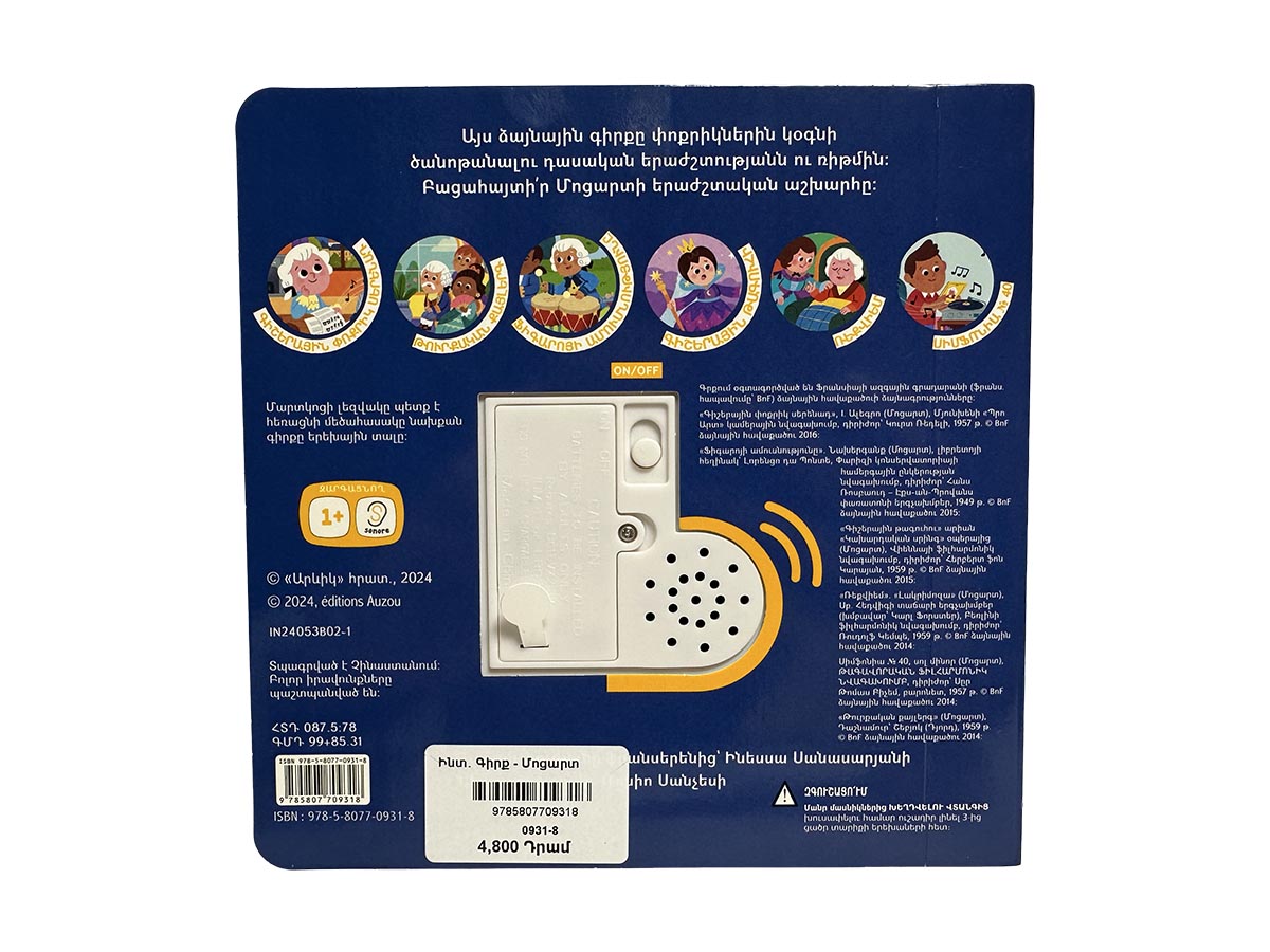 Այս երաժշտական գիրքը երեխաներին ծանոթացնում է Մոցարտի հանճարեղ երաժշտությանը՝ դարձնելով դասականը հասանելի և հետաքրքիր փոքրիկների համար։ Յուրաքանչյուր էջում առկա կոճակները թույլ են տալիս լսել տարբեր մեղեդիներ։