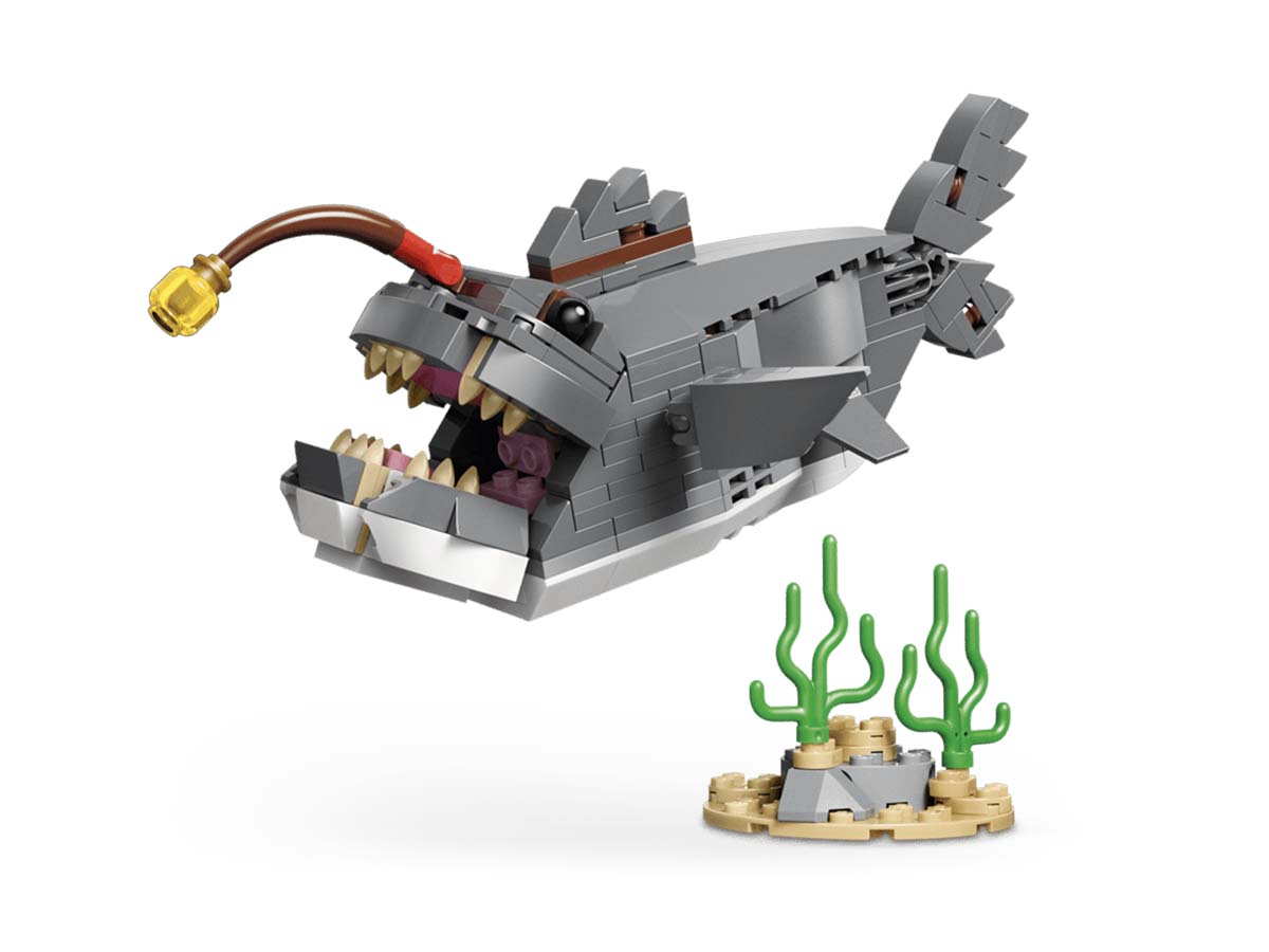 ⚙️ Հատկություններ — 3-ը 1-ում կառուցման տարբերակներ (շնաձուկ, լապտերաձուկ, սկատ), շարժվող մասեր (ծնոտ, լողակներ, պոչ), ցուցադրման հենարաններ
