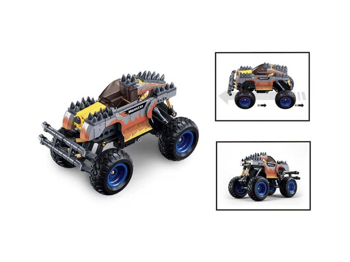 ⚙️ Առանձնահատկություններ — օֆրոդ մոնստր մեքենա (Bigfoot ոճ), մեծ անիվներ, pull-back ինერცիոն մեխանիզմ, շարժվող անիվներ, վառ դիզայն (կրակի էֆեկտներով), համատեղելի այլ կոնստրուկտորների հետ